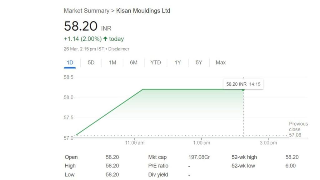 किसान मोल्डिंग्स लिमिटेड के स्टॉक में मंगलवार को दो प्रतिशत यानी 1.14 रुपये की तेजी देखने को मिली थी. पिछले पांच दिनों में इसने निवेशकों को 8.20 प्रतिशत यानी 4.41 रुपये का रिटर्न दिया है. वहीं, एक महीने में निवेशकों ने झोली भरकर 49.65 प्रतिशत का रिटर्न पाया है. पिछले छह महीने में कंपनी के स्टॉक ने 305.29 रुपये का रिटर्न पाया है. जबकि, सालाना आधार पर कंपनी ने 766.07 प्रतिशत का सुपर बंपर रिटर्न दिया है.