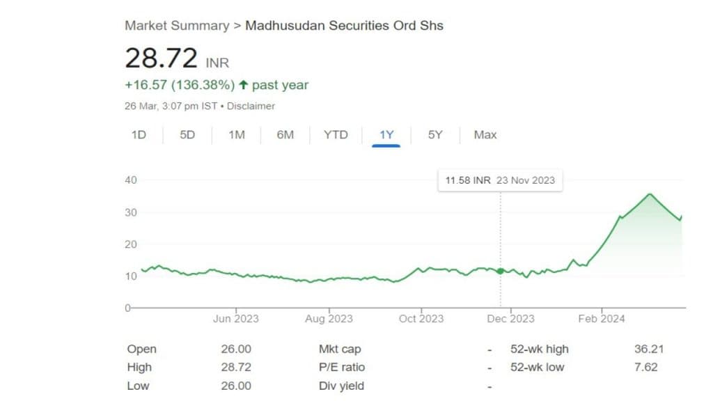 मधुसूदन सिक्योरिटीज के स्टॉक में मंगलवार को अपर स्रिकट लगा था. कंपनी के स्टॉक ने छहमाही आधार पर निवेशकों को 141.95 रुपये का रिटर्न दिया है. जबकि, सालाना आधार पर 136.38 प्रतिशत और पांच सालों में 759.88 प्रतिशत का रिटर्न निवेशकों से मिला है.