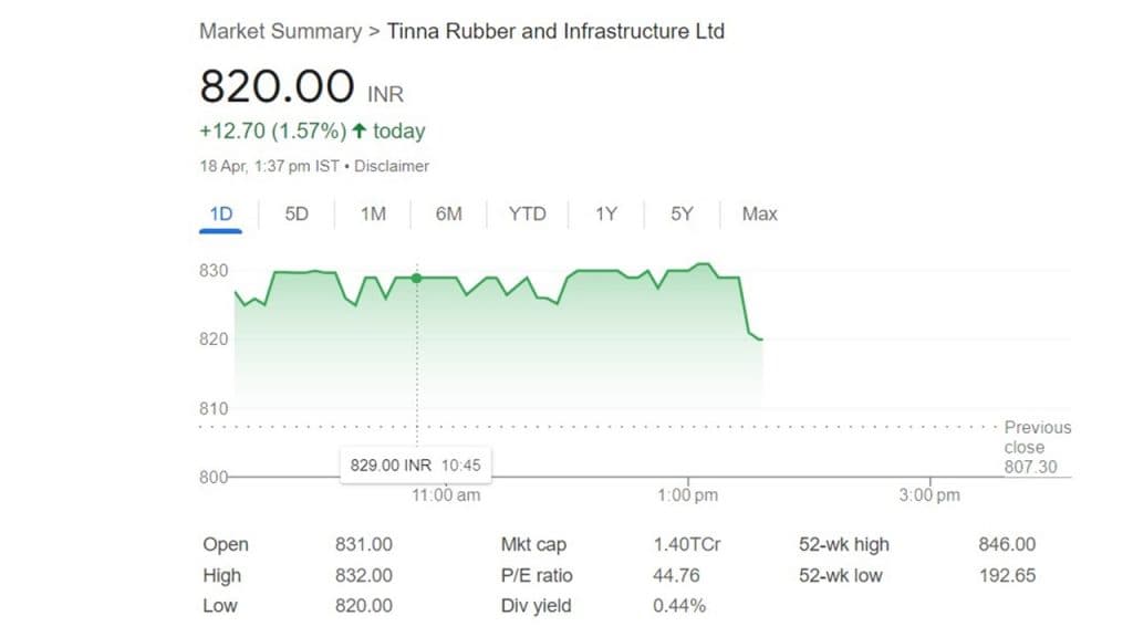 Multibagger Stocks: भारतीय शेयर बाजार में तीन दिनों के बाद आज तेजी देखने को मिली. प्री-ओपनिंग में अच्छी शुरुआत के बाद बाजार में तेजी का रूख जारी रहा. हालांकि, दोपहर 1.25 बजे अचानक सेंसेक्स 150 अंक टूटकर 72,818 पर कारोबार कर रहा था. जबकि, निफ्टी 39.58 अंक गिरकर 22,108.35 पर था. हालांकि, इस बीच भी एक ऐसा स्टॉक है जिसमें 1.57 प्रतिशत की तेजी देखने को मिल रहा है. केवल 18 रुपये वाले इस स्टॉक की कीमत तीन साल में 800 के पार पहुंच गया है. ये कंपनी है टिन्ना रबर एंड इंफ्रास्ट्रक्चर लिमिटेड. टायर के कारोबार से जुड़ी इस कंपनी के स्टॉक ने निवेशकों को पांच सालों में 5,057.23 प्रतिशत का रिटर्न दिया है.