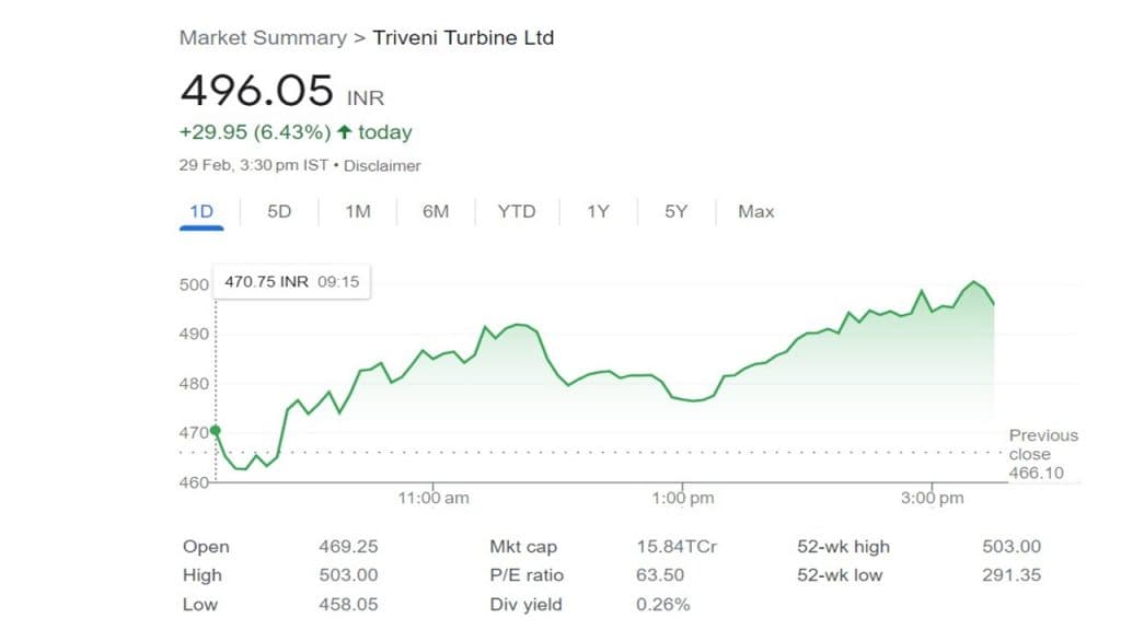 Multibagger Stocks त्रिवेणी टर्बाइन ने निवेशकों को पिछले पांच कारोबारी दिनों में 7.77 प्रतिशत यानी 35.77 रुपये का रिटर्न दिया है. जबकि, छह महीने में 27.40 प्रतिशत यानी 106.70 रुपये का रिटर्न दिया है. पिछले साल एक मार्च को कंपनी के स्टॉक की कीमत 344.90 रुपये था. कोविड के शुरुआत के समय 20 मार्च 2020 को कंपनी के स्टॉक की कीमत 50.50 रुपये थी. हालांकि, फिर कीमत लगातार बढ़ती गयी. पिछले 52 सप्ताह में कंपनी के स्टॉक न्यूनतम 291.35 रुपये तक टूटकर गया है. जबकि, इसी अवधि में 503 रुपये ऑल टाइम हाई को भी छूआ है.
