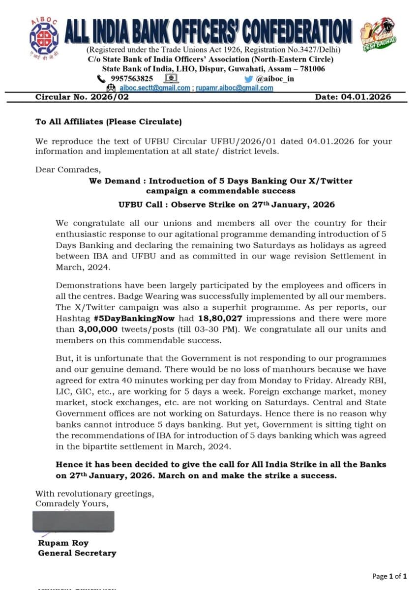 UFBU ने आरोप लगाया है कि सरकार उनकी वाजिब और लंबे समय से लंबित मांगों पर कोई ठोस प्रतिक्रिया नहीं दे रही है, जिससे बैंक कर्मचारियों में नाराजगी बढ़ रही है. इसी असंतोष के चलते 27 जनवरी 2026 को सभी बैंकों में अखिल भारतीय हड़ताल का निर्णय लिया गया है. संघ के अनुसार, 5-दिवसीय बैंकिंग सप्ताह की मांग को लेकर सोशल मीडिया पर चलाया जा रहा अभियान #5DayBankingNow काफी प्रभावी साबित हुआ है. अब तक इस अभियान को X (पूर्व में ट्विटर) पर 18.8 लाख से अधिक इम्प्रेशन और लगभग 2.85 लाख पोस्ट मिल चुकी हैं.