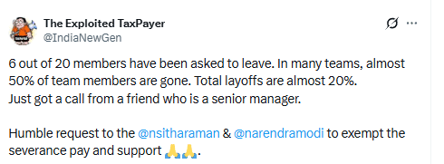 20 में से 6 सदस्यों को नौकरी छोड़ने के लिए कहा गया है. कई टीमों में, लगभग 50% सदस्य जा चुके हैं. कुल छंटनी लगभग 20% है. अभी-अभी एक दोस्त का फोन आया, जो एक सीनियर मैनेजर है.