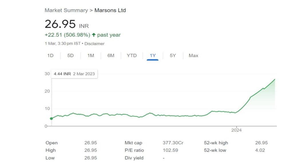 Penny Stock: भारतीय शेयर बाजार में फरवरी के महीने में औसत रुप से जबरदस्त तेजी का रुख देखने को मिला. इस महीने बॉम्बे स्टॉक एक्सचेंज के सूचकांक सेंसेक्स में 2.30 प्रतिशत यानी 1659.72 अंकों की तेजी देखने को मिली. जबकि, नेशनल स्टॉक एक्सचेंज के सूचकांक निफ्टी में 2.17 प्रतिशत यानी 473.50 अंकों रही. इस दौरान कई कंपनियों के शेयर ने निवेशकों को बेहतरीन रिर्न दिया. आज हम आपको एक ऐसे कंपनी के स्टॉक के बारे में जानकारी देंगे जिसने निवेशकों को एक साल में 506 प्रतिशत का रिटर्न दिया है. हम बात कर रहे हैं पेनी स्टॉक मार्सन्स लिमिटेड की. मार्सन्स लिमिटेड के शेयर का भाव इस सप्ताह के आखिरी कारोबारी दिन 1.97 प्रतिशत यानी 0.52 पैसे की तेजी के साथ 26.95 रुपये पर बंद हुआ. एक साल पहले दो मार्च 2023 को कंपनी के स्टॉक की कीमत 4.44 पैसे था.