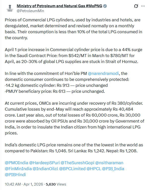 | घरेलू LPG (14.2kg) | ₹913 | कोई बदलाव नहीं |