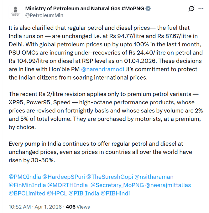 मंत्रालय ने साफ किया है कि देश के आम नागरिक जिस साधारण पेट्रोल और डीजल का इस्तेमाल करते हैं, उनकी कीमतों में कोई बदलाव नहीं किया गया है. दिल्ली में पेट्रोल ₹94.77/लीटर और डीजल ₹87.67/लीटर पर ही बना हुआ है. हॉर्मुज जलडमरूमध्य (Strait of Hormuz) में तनाव के कारण वैश्विक तेल कीमतें $113 से $149 प्रति बैरल के बीच झूल रही हैं, जिसके चलते सरकारी तेल कंपनियाँ (OMCs) पेट्रोल पर ₹24.40 और डीजल पर ₹104.99 प्रति लीटर का भारी घाटा खुद सह रही हैं ताकि देश में महंगाई न बढ़े.