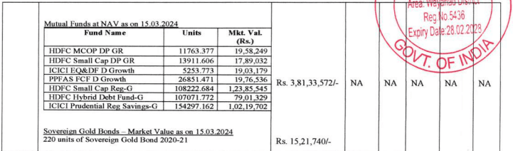 राहुल गांधी के पोर्टफोलियो में सोने का भी स्थान है. उन्होंने Sovereign Gold Bond 2020-21 की 220 यूनिट्स खरीदी हुई हैं. मार्च 2024 की रिपोर्ट के मुताबिक इनकी वैल्यू लगभग ₹2.64 लाख मानी जा सकती है.