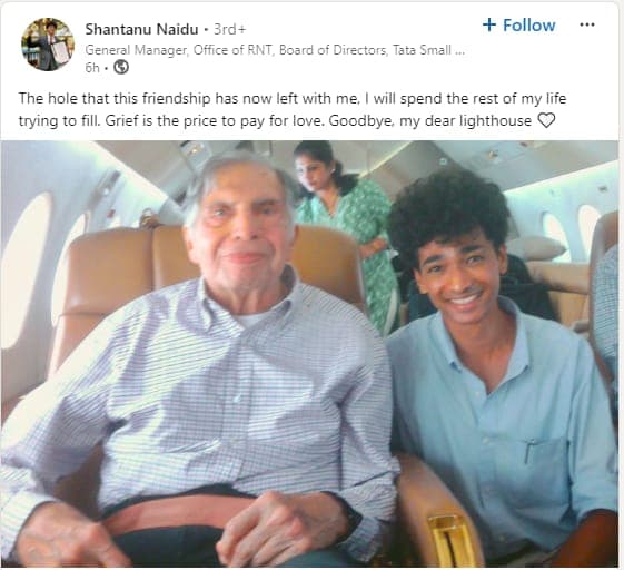 इस संदेश के साथ, शांतनु नायडू को सुबह-सुबह एक अनोखी और भावुक तस्वीर में देखा गया, जिसमें वह अपनी मोटरसाइकिल पर सवार होकर रतन टाटा के पार्थिव शरीर को ले जा रहे ट्रक के आगे चल रहे थे. यह दृश्य लोगों के दिलों को छू गया. इसके अलावा, नायडू ने एक पुरानी तस्वीर साझा की, जिसमें वे और रतन टाटा एक चार्टर्ड विमान में बैठे हुए दिखाई दे रहे थे. उस तस्वीर के साथ नायडू ने लिखा, “प्यार की असली कीमत दुःख में चुकानी पड़ती है. अलविदा, मेरी जीवन की रोशनी.”