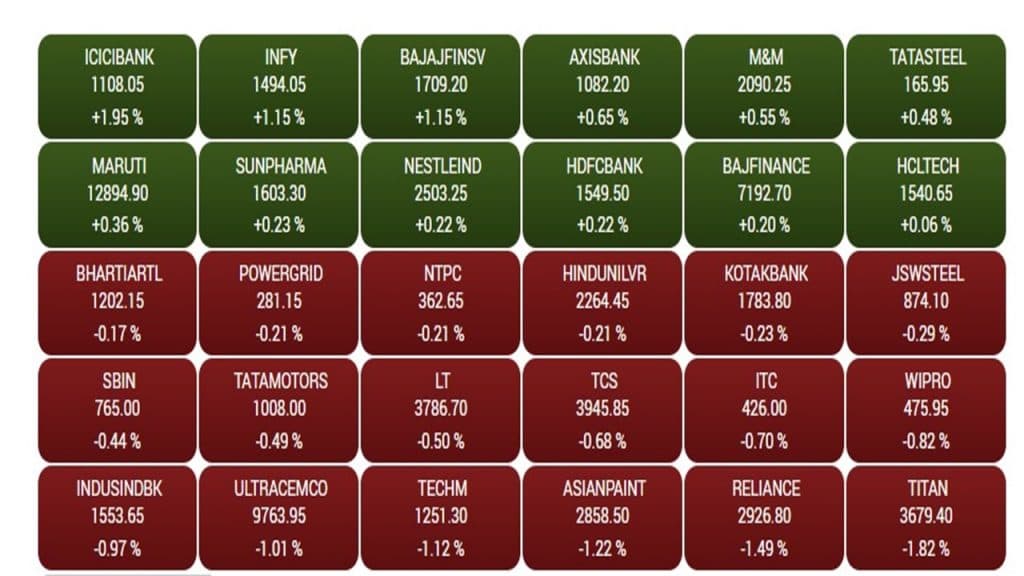 बीएसई के तीस शेयर वाले सेंसेक्स पर बाजार बंद होने तक 12 कंपनियों के स्टॉक मुनाफे में बंद हुए. जबकि, 18 कंपनियों के शेयर में लाल का निशान लगा दिखा. निफ्टी पर मिलाजुला कारोबार देखने को मिला. सबसे ज्यादा तेजी बैंकिंग और मेटल सेक्टर में बनी रही. जबकि, एफएमसीजी 336 अंक टूट गया. इसके अलावा, ऑटो, फॉर्मा, कंज्यूमर ड्यूरेबल और ऑयल एंड गैस में भी सुस्ती देखने को मिली. निफ्टी पर अपोलो हॉस्पिटल, आईसीआईसीआई, हिंडाल्को, इफोसिस, बजाज फिनसर्व और आयशर मोटर्स के स्टॉक टॉप गेनर्स में शामिल हुए. जबकि, टाइटेन, हीरो मोटोकॉर्प, कोल इंडिया, रिलायंस और एशियन पेंट्स के स्टॉक टॉप लूजर की श्रेणी में शामिल हुए.
