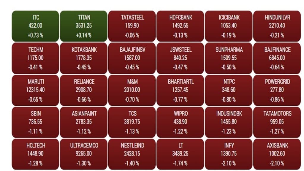 पिछले पांच दिनों में बाजार में निवेशों की पूंजी में 9.28 लाख करोड़ रुपये की गिरावट देखने को मिली है. आज भी ऐसी स्थिति देखने को मिल रही है. बीएसई के तीस शेयरों वाले सेंसेक्स पर केवल दो कंपनियों के स्टॉक में मामूली तेजी देखने को मिल रही है. जबकि, 28 कंपनियों के स्टॉक में लाल का निशान देखने को मिल रहा है. निफ्टी पर सभी सेक्टरों में गिरावट देखने को मिल रही है. आईटी सेक्टर में 490 अंक की गिरावट देखने को मिल रही है. जबकि, बैंक 252 अंक, ऑटो 223 अंक, फाइनेंशियल सर्विस 113 अंक, एफएमसीजी 141 अंक और कंज्यूमर ड्यूरेबल 207 अंक टूटा दिख रहा है.