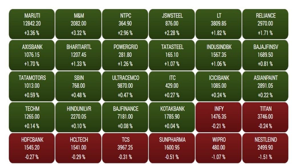 बाजार की तेजी के बीच, बीएसई के तीस शेयरों वाले सेंसेक्स पर आठ कंपनियों के स्टॉक नुकसान में रहे. जबकि, 22 कंपनियों के स्टॉक में तेजी देखने को मिली. वहीं, निफ्टी पर आईटी और पीएसयू बैंक को छोड़कर सभी सेक्टरों में गिरावट देखने को मिली. इसके अलावे, ऑटो 457 अंक, बैंक 103 अंक, कंज्यूमर ड्यूरेबल 283 अंक और ऑयल एंड गैस 166 अंकों की तेजी के साथ बंद हुए. निफ्टी पर आज आयशर मोटर्स, मारुति, महिंद्रा एंड महिंद्र, एसबीआई लाइफ, जेएसडब्लू स्टील और एनटीपीसी के स्टॉक टॉप गेनर्स की श्रेणी में शामिल हुए. जबकि, अदाणी पोर्ट्स, नेस्ले इंडिया, अपोलो हॉस्पिटल, विप्रो और सन फॉर्मा के शेयर टॉप लूजर्स की श्रेणी में शामिल हुए.