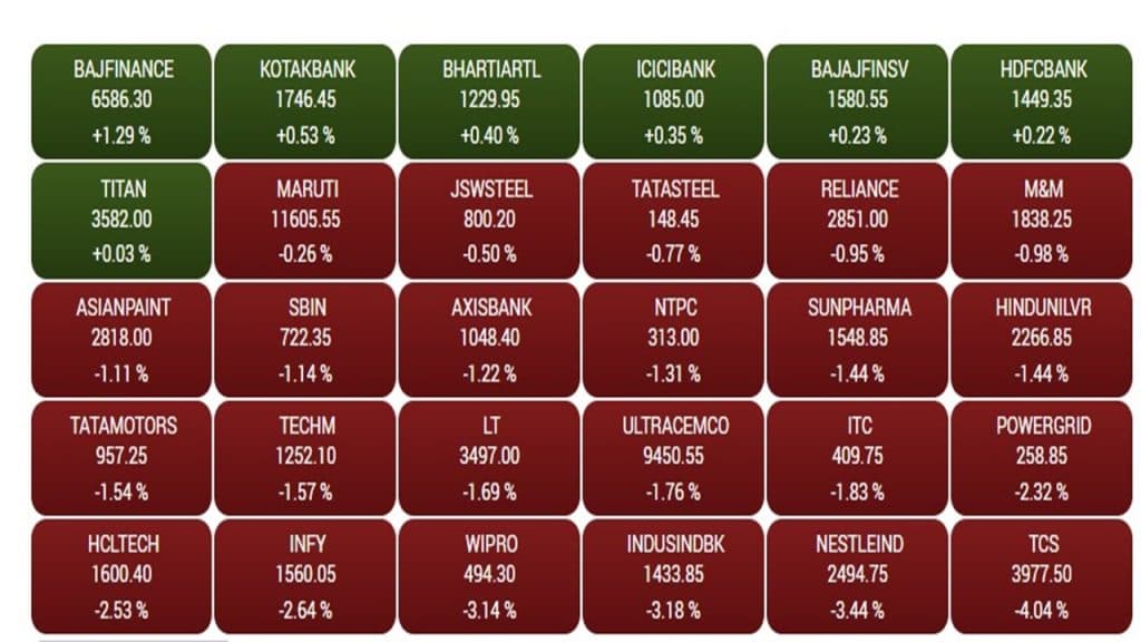 पूरे दिन सेंसेक्स और निफ्टी दबाव में कारोबार करते हुए बंद हुए. निफ्टी पर बिकवाली इस तरह हावी था कि एक समय 50 में से 43 कंपनियों के शेयर नुकासान में कारोबार करते हुए दिखे. वहीं, बीएसई के तीस शेयरों वाले सेंसेक्स पर केवल छह कंपनियां लाभ के निशान के साथ बंद हुई. जबकि, 24 कंपनियां नुकसान में बंद हुई. निफ्टी पर बाजार बंद होने तक किसी सेक्टर में लाभ देखने को नहीं मिला. निफ्टी बैंक 220 अंक, ऑटो 106 अंक, एफएमसीजी 1168 अंक, आईटी 1084 अंक और फॉर्मा 432 अंक गिरा. बजाज ऑटो, बजाज फाइनेंस, कोटक महिंद्रा, भारती एयरटेल और हिंडाल्को के शेयर आज बाजार में टॉप गेनर्स में शामिल हुए. हालांकि, बीपीसीएल, टीसीएस, सिप्ला, टाटा कंज्यूमर, डॉ रेड्डी, नेस्ले, ब्रिटेनिया, इंडसइंड बैंक और विप्रो तीन प्रतिशत से ज्यादा टूटकर टॉप लूजर्स की श्रेणी में शामिल हुए.