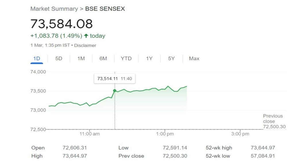 Share Market: बीएसई सेंसेक्स कारोबार के दौरान आज पहली बार 73644.97 के उच्चतम स्तर पर पहुंच गया. इंट्राडे ट्रेड के दौरान सेंसेक्स ने 1000 अंकों से ज्यादा का उछाल दिखाया है.