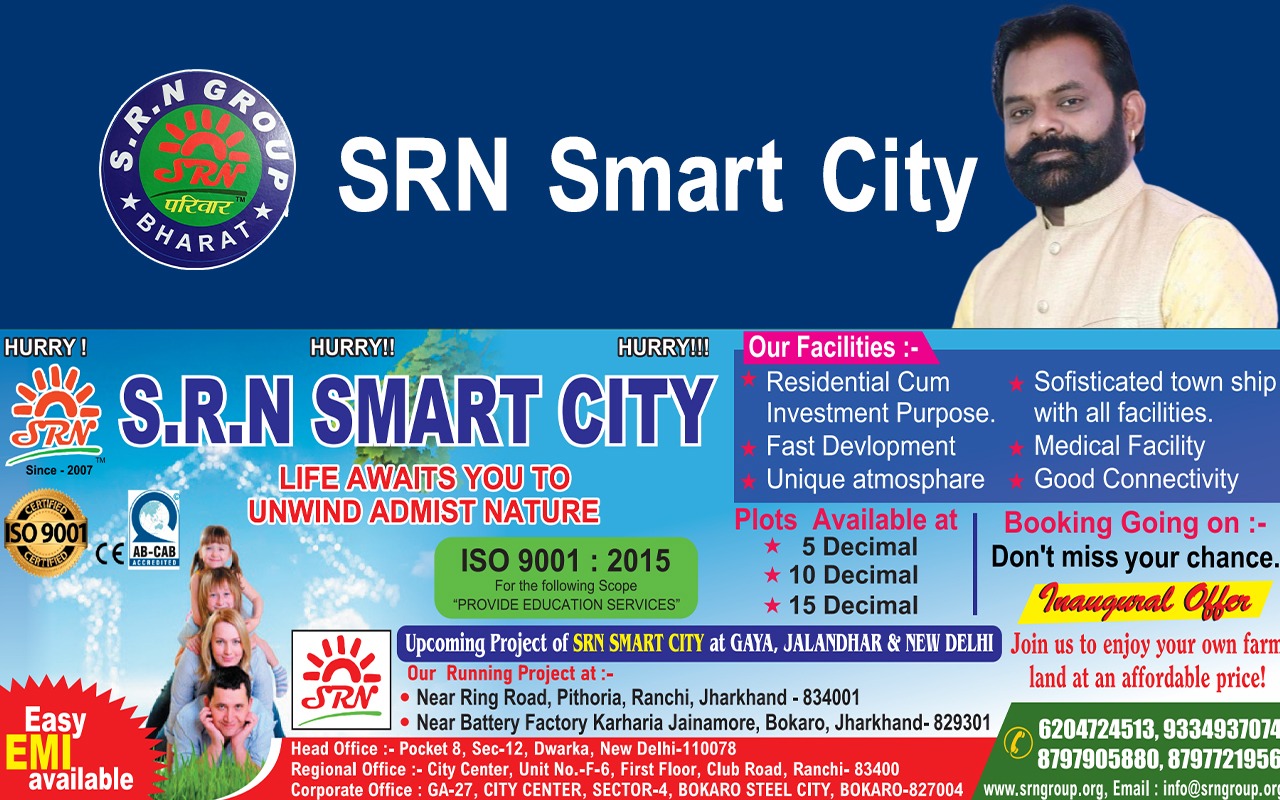 एसआरएन ग्रुप ने रांची के पिठोरिया में एक स्मार्ट सिटी बनाने की शुरुआत की है. एसआरएन ग्रुप का यह स्मार्ट प्रोजेक्ट 300 एकड़ में फैला हुआ है. इस स्मार्ट सिटी में रहने वाले लोगों को अस्पताल, स्कूल, पार्क और मंदिर की सुविधा मिलेगी. इस संबंध में एसआरएन ग्रुप के चेयरपर्सन डाॅ नवल शर्मा ने बताया कि हमारा मूलमंत्र है-हेल्प दि पीपुल्स गाॅड हेल्प यू.