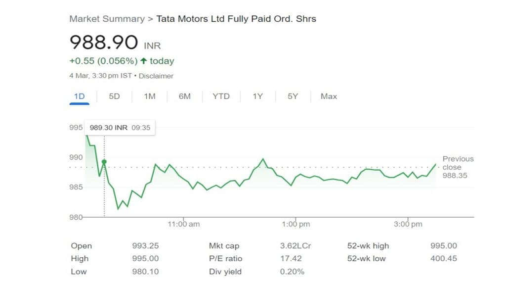 Tata Motors Demerger: सोमवार को टाटा मोटर्स के स्टॉक मात्र 0.55 पैसे की मामूली बढ़त के साथ बंद हुआ था. हालांकि, कंपनी ने निवेशकों को पिछले पांच दिनों में 5.15 प्रतिशत का रिटर्न दिया है.