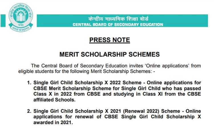 इस स्कॉलरशिप के लिए आवेदन करने के इच्छुक छात्र इस बात का ध्यान रखें कि इसके लिए वे छात्राएं आवेदन कर सकती हैं जो अपने माता-पिता की एकलौती संतान हैं. जिन्होंने सीबीएसई दसवीं कक्षा की परीक्षा 60% या अधिक अंकों के साथ उत्तीर्ण की है और ग्यारहवीं कक्षा की उनकी आगे की स्कूली शिक्षा सीबीएसई बोर्ड से ही जारी है. बोर्ड की ओर से नोटिफिकेशन में साफ कहा गया है कि आवेदन के लिए हार्डकॉपी स्वीकार नहीं किये जायेंगे. फ्रेश एप्लीकेशन और रिन्यूएबल दोनों ही तरह के एप्लीकेशन के लिए नोटिफिकेशन जारी किये गये हैं. छात्राओं को ऑनलाइन आवेदन करना होगा. पूरी डिटेल जानकारी के लिए यहां दिये गये नोटिफिकेशन लिंक (CBSE MERIT SCHOLARSHIP SCHEME, FOR SINGLE GIRL CHILD) पर क्लिक करें.