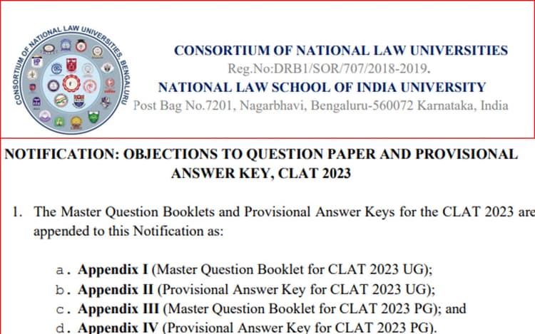 CLAT 2023 के जारी प्रोविजनल आंसर की को भी चुनौती दी जा सकती है और आपत्तियां भेजी जा सकती हैं. क्लैट 2023 आंसर की चैलेंज विंडो 19 दिसंबर को सुबह 9 बजे लाइव हो चुकी है और 20 दिसंबर (सुबह 9 बजे) तक सक्रिय रहेगी.