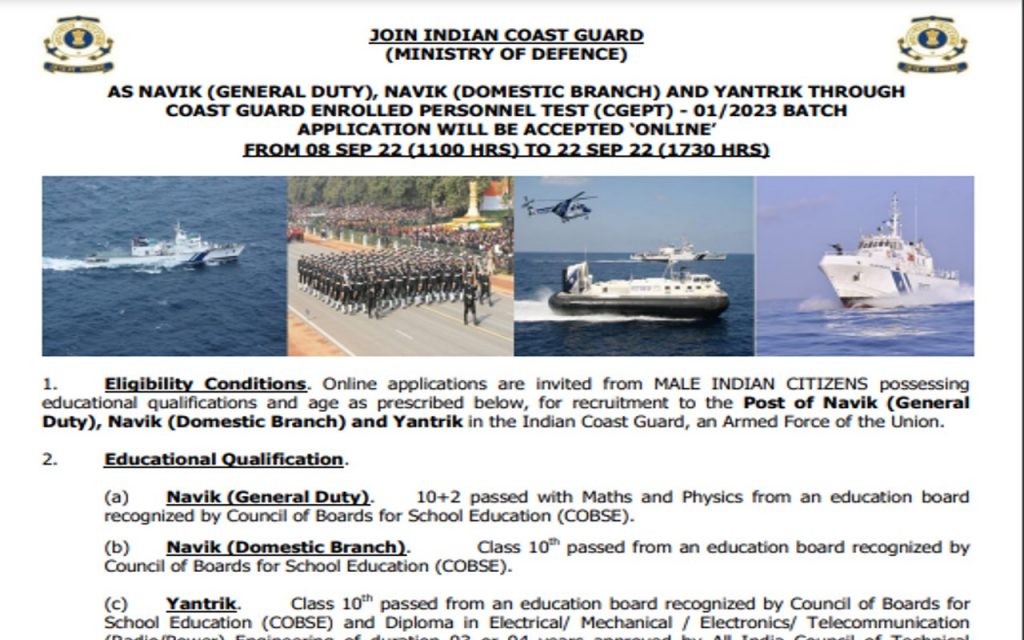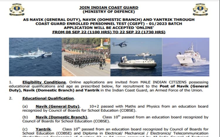 इंडियन कोस्ट गार्ड (Indian Coast Guard) दसवीं, बारहवीं पास एवं इंजीनियरिंग डिप्लोमा होल्डर पुरुष अभ्यर्थियों के लिए सरकारी नौकरी (Government Job) हासिल करने का बेहतरीन मौका लेकर आया है. भारत सरकार के रक्षा मंत्रालय (Ministry of Defence) के तहत समुद्री सुरक्षा के लिए काम करनेवाले इंडियन कोस्ट गार्ड में नाविक एवं यांत्रिक के पदों पर भर्ती के लिए आवेदन मांगे गये हैं. आप अगर एक चुनौतीपूर्ण व देश की सुरक्षा (Country’s Security) से संबंधित कार्यक्षेत्र में भविष्य बनाना चाहते हैं, तो 22 सितंबर तक आवेदन कर सकते हैं.