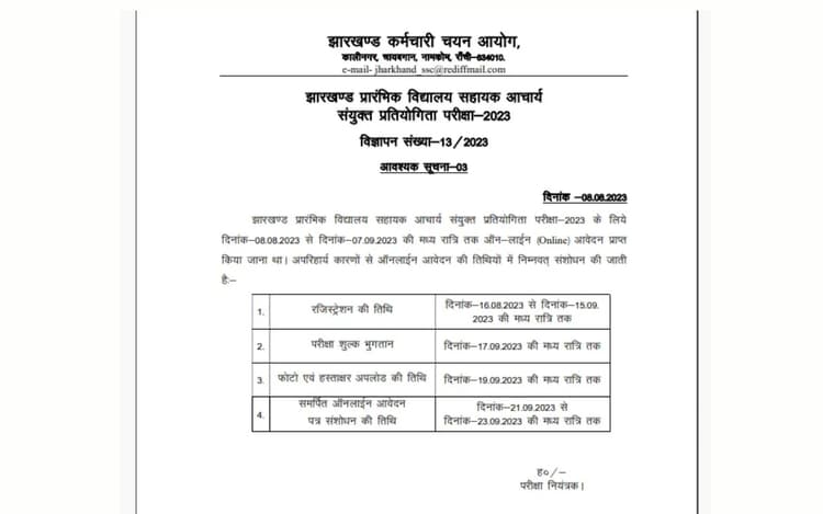 झारखंड जेएसएससी शिक्षक रिक्ति 2023 ऑनलाइन आवेदन 16 अगस्त 2023 से शुरू है. झारखंड कर्मचारी चयन आयोग (जेएसएससी) के अनुसार सभी महत्वपूर्ण तिथियां उम्मीदवारों के संदर्भ के लिए नीचे दी गई तालिका में उल्लिखित हैं. चेक करें