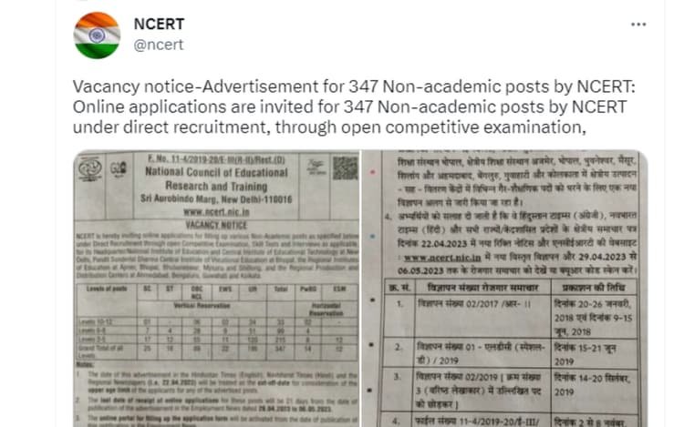 NCERT Recruitment 2023: नेशनल काउंसिल फोर एजुकेशन रिसर्च एंड ट्रेनिंग (NCERT) ने 347 नॉन एकेडमिक पदों के लिए आवेदन आमंत्रित किये गये हैं. आवेदन प्रक्रिया 29 अप्रैल से शुरू हो रही है. इच्छुक उम्मीदवार एनसीईआरटी की आधिकारिक वेबसाइट ncert.nic.in के माध्यम से ऑनलाइन आवेदन कर सकेंगे. ऑनलाइन आवेदन जमा करने की अंतिम तिथि 29 अप्रैल से 5 मई 2023 तक रोजगार समाचार में विज्ञापन के प्रकाशन से 21 दिन होगी.