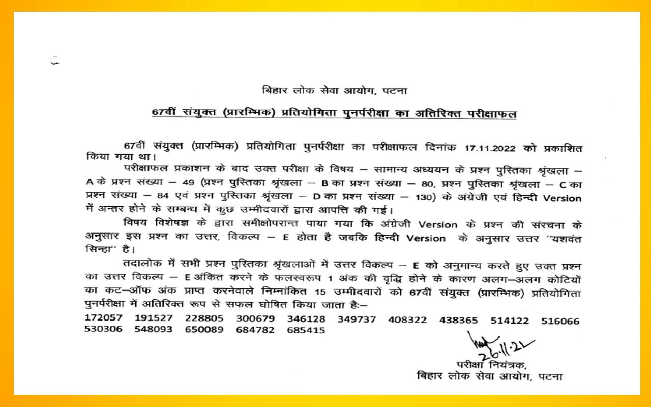 समिति ने सभी प्रश्न पुस्तिकाओं में उत्तर विकल्प-ई की अनुमति दी. उत्तर विकल्प-ई को चिन्हित करने के फलस्वरूप एक अंक बढ़ा दिया गया है. अत: संशोधित कट ऑफ अंक के अनुसार विभिन्न श्रेणियों के कट ऑफ अंक प्राप्त करने वाले निम्नलिखित 15 अभ्यर्थियों को 67वीं संयुक्त (Preliminary) प्रतियोगी Re-examination के लिए सफल घोषित किया गया है.