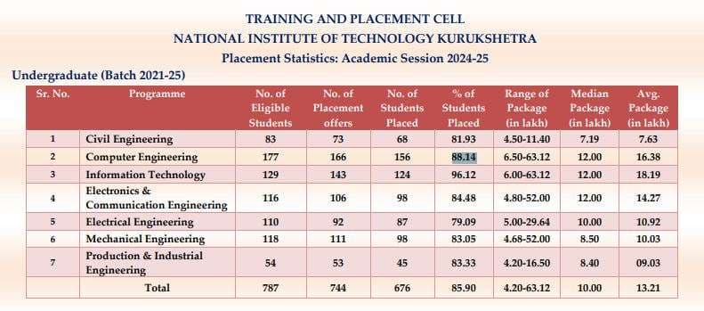 नेशनल इंस्टीट्यूट ऑफ टेक्नोलॉजी (NIT) कुरुक्षेत्र देश के टॉप इंजीनियरिंग कॉलेजों में गिना जाता है. यहां के 2025 बैच के प्लेसमेंट रिजल्ट इस बार जबरदस्त रहे हैं. आंकड़ों के मुताबिक, इस साल कैंपस प्लेसमेंट में सबसे बड़ा पैकेज 63 लाख 12 हजार रुपये का गया है.
