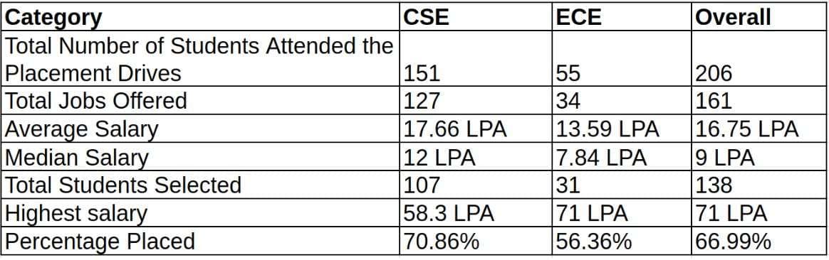 CSE ब्रांच के छात्रों को 127 ऑफर मिले जबकि ECE के छात्रों को 34 ऑफर प्राप्त हुए. औसत वेतन (Average Salary) की बात करें तो CSE के छात्रों को 17.66 लाख रुपये प्रति वर्ष, और ECE के छात्रों को 13.59 लाख रुपये प्रति वर्ष का औसत पैकेज मिला. कुल औसत वेतन 16.75 लाख का रहा.
