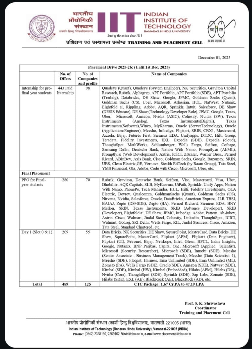 We are excited to announce the commencement of the campus placement drive 2025-26 at IIT (BHU), Varanasi, at the stroke of midnight on December 1st, 2025.