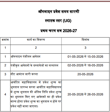 UG यानी अंडर ग्रेजुएशन के कोर्स के लिए ऑनलाइन रजिस्ट्रेशन 1 मई 2026 से शुरू होंगे और 15 मई 2026 तक चलेंगे. पंजीकृत आवेदनों के दस्तावेजों का सत्यापन 2 मई से 16 मई 2026 तक किया जाएगा. इसके बाद 20 मई 2026 को मेरिट के आधार पर सीट आवंटन किया जाएगा. सीट मिलने के बाद छात्रों को 20 मई से 26 मई 2026 तक प्रवेश फीस जमा करना होगा.
