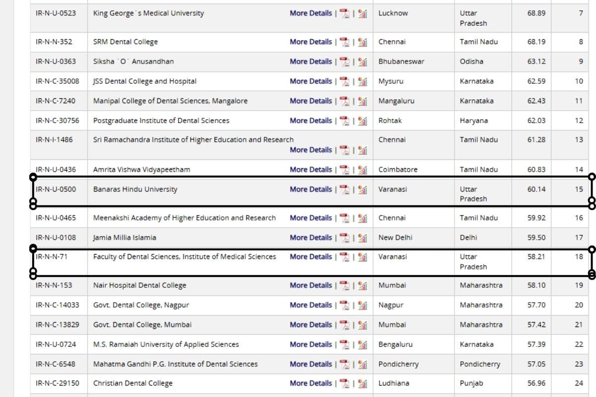बीएचयू के इस कॉलेज का दोनों जगह डेटा भी अलग-अलग है. रैंक 15 पर इस कॉलेज का स्कोर 60.14 है. वहीं, रैंक 18 परप इस कॉलेज का स्कोर 58.21 है. बनारस हिंदू यूनिवर्सिटी की बात करें तो यहां के मेडिकल कॉलेज का नाम इंस्टीट्यूट ऑफ मेडिकल साइंसेंज यानी IMS है. इसके अलावा बीएचयू का अपना कोई अलग डेंटल हॉस्पिटल नहीं है.