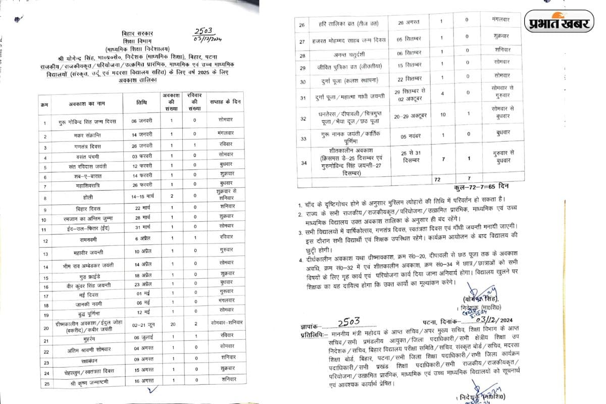 बिहार शिक्षा विभाग ने वर्ष 2025 के लिए सरकारी स्कूलों की छुट्टियों की सूची पहले ही जारी कर दी है. इस वर्ष, कुल 72 छुट्टियां निर्धारित की गई हैं, जो पूरे वर्ष के लिए लागू होंगी. इन छुट्टियों में सरकारी, सरकारी सहायता प्राप्त, परियोजना, उत्क्रमित, प्राथमिक, माध्यमिक और उच्च माध्यमिक विद्यालयों को शामिल किया गया है.