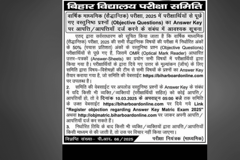 - उत्तर कुंजी अब आधिकारिक वेबसाइट biharboardonline.com पर जारी कर दी गई है