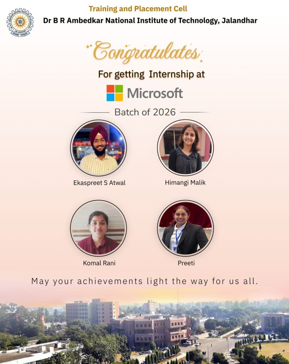 Best BTech Branch: डॉ बीआर अंबेडकर नेशनल इंस्टीट्यूट ऑफ टेक्नोलॉजी जालंधर (NIT Jalandhar) की तरफ से कैंपस प्लेसमेंट रिपोर्ट जारी की गई है. इस साल कॉलेज का प्लेसमेंट काफी शानदार रहा है. यहां के कई छात्रों को माइक्रोसॉफ्ट और Amazon जैसी कंपनियों में इंटर्वशिप और प्लेसमेंट ऑफर मिले हैं. इन्हीं में एक नाम हिमांगी मलिक का है. हिमांगी को माइक्रोसॉफ्ट में इंटर्नशिप करने का मौका मिला है. खास बात ये है कि उन्होंने बीटेक कंप्यूटर साइंस नहीं बल्कि किसी और ब्रांच में एडमिशन लिया है.