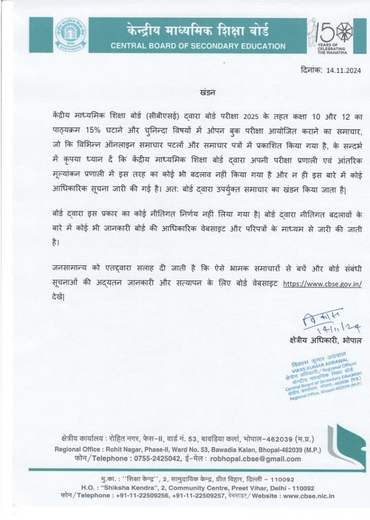 कुछ मीडिया रिपोर्ट्स नियर दावा किया था कि सीबीएसई ने 10वीं और 12वीं की बोर्ड परीक्षा के सिलेबस में बदलाव करने का फैसला लिया है. इन सभी बातों को गलत साबित करते हुए सीबीएसई ने आधिकारिक नोटिस जारी कर कहा ‘2025 में कक्षा दसवीं और बारहवीं की परीक्षाओं के लिए 15% सिलेबस में कमी और चुनिंदा विषयों में ओपन बुक परीक्षा की संभावना के बारे में सीबीएसई पुष्टि करता है कि इसकी परीक्षा या मूल्यांकन प्रणाली में कोई बदलाव नहीं किया गया है. इस मामले पर कोई आधिकारिक अधिसूचना जारी नहीं की गई है और बोर्ड इस सूचना को झूठा बताता है. सभी नीतिगत बदलाव केवल आधिकारिक सीबीएसई वेबसाइट cbse.gov.in और परिपत्रों के माध्यम से जारी किए जाते हैं. सभी लोगों को यह सलाह दी जाती है कि ऐसे भ्रामक समाचारों से बचें और बोर्ड संबंधी सूचनाओं की जानकारी प्राप्त करने के लिए बोर्ड की वेबसाइट देखें.’