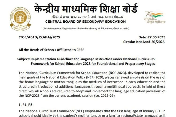CBSE Important Notice in Hindi: केंद्रीय माध्यमिक शिक्षा बोर्ड (CBSE) ने एनसीएफ 2023 (नेशनल करिकुलम फ्रेमवर्क) के तहत भाषा शिक्षण के लिए एक नई कार्य योजना जारी की है. इस योजना के अनुसार, सभी सीबीएसई से संबद्ध स्कूलों को मई 2025 के अंत तक जरूरी तैयारियां पूरी करनी होंगी. इस दिशा-निर्देश का उद्देश्य सभी छात्रों को उनकी मातृभाषा में मजबूत आधार देना और बहुभाषी शिक्षा को बढ़ावा देना है. यहां आप सीबीएसई के नोटिस के बारे में विस्तार से समझ सकते हैं.