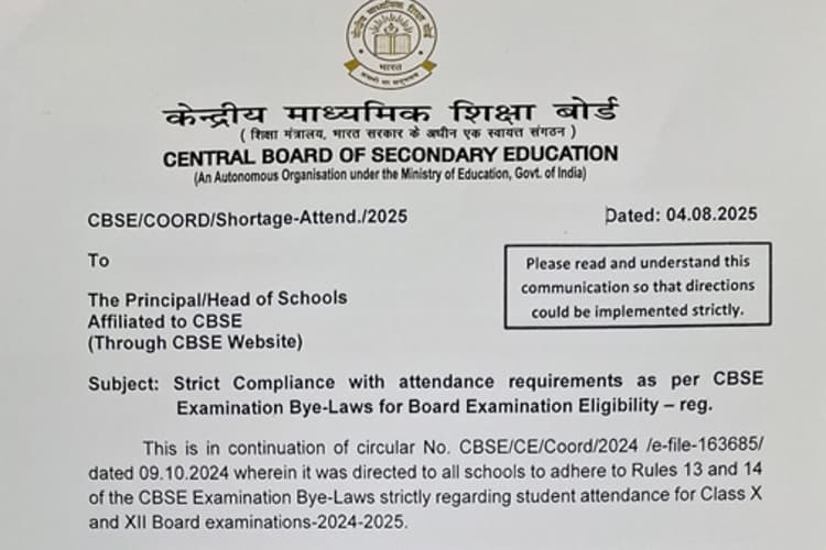CBSE Important Notice 2025 in Hindi: कक्षा 10वीं और 12वीं के छात्रों के लिए एक महत्वपूर्ण अपडेट सामने आया है. CBSE (केंद्रीय माध्यमिक शिक्षा बोर्ड) ने एकेडमिक सेशन 2025-26 के बोर्ड परीक्षार्थियों के लिए 75% उपस्थिति अनिवार्य कर दी है. यह निर्देश 4 अगस्त 2025 को जारी हुआ है और यह 9 अक्टूबर 2024 को जारी पुराने सर्कुलर का ही विस्तार है. इस नियम का उद्देश्य छात्रों की पढ़ाई में नियमितता लाना और परीक्षा की गंभीरता को बनाए रखना है. इस बार CBSE ने स्कूलों के लिए विस्तृत SOP (Standard Operating Procedure) भी जारी किया है ताकि कम उपस्थिति वाले मामलों को सही तरीके से संभाला जा सके. यहां देखें डिटेल में.