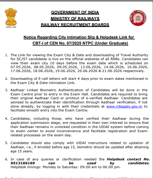 RRB NTPC Exam City Notice यहां चेक करें