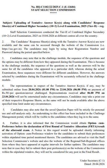 कैंडिडेट्स 20 अप्रैल 2026 शाम 6 बजे से लेकर 23 अप्रैल 2026 शाम 6 बजे तक आपत्ति दर्ज कर सकते हैं. हर सवाल के लिए 100 रुपये फीस देनी होगी. अगर आपकी आपत्ति सही पाई जाती है, तो फाइनल आंसर की में बदलाव किया जाएगा.