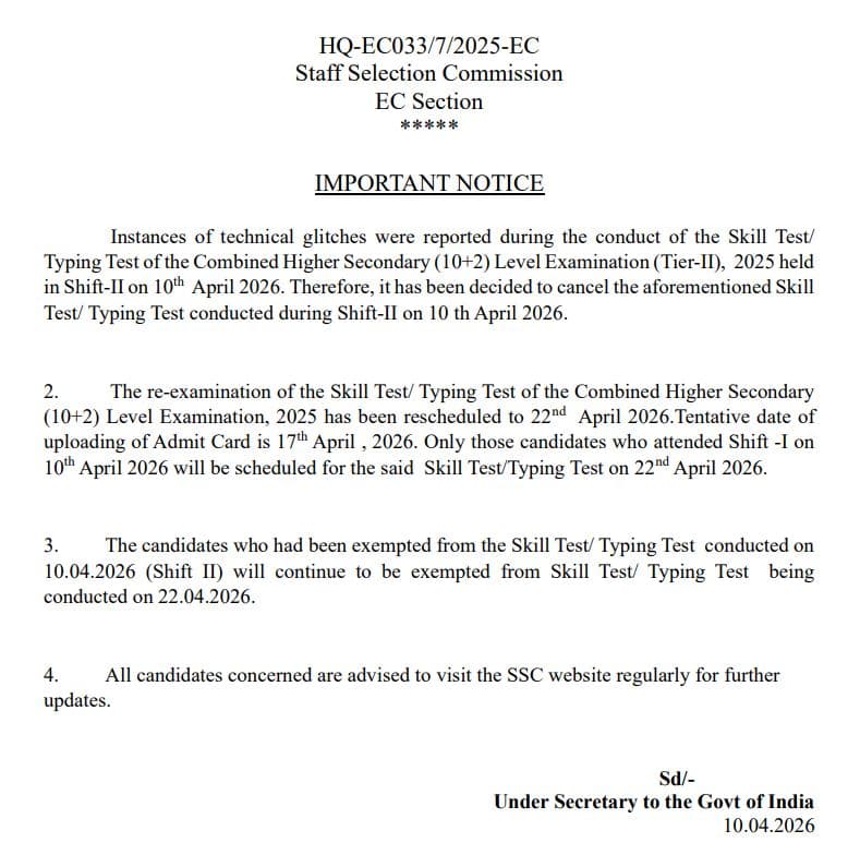 SSC CHSL Typing Test: SSC की परीक्षा में इस बार ट्विस्ट आया है. कैंडिडेट्स एग्जाम देकर निकले ही थे कि पता चला टाइपिंग स्किल टेस्ट कैंसिल हो गया है. अब जिन उम्मीदवारों ने 10 अप्रैल 2026 को Shift-II में Skill या Typing Test दिया था, उन्हें एक बार फिर से अपनी उंगलियों की स्पीड दिखानी पड़ेगी.