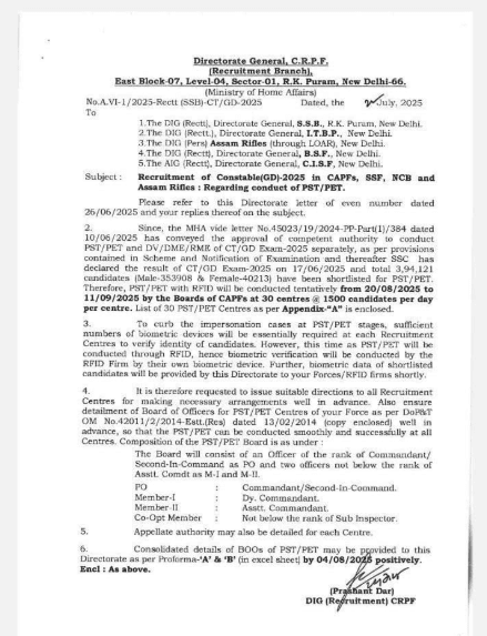 नोटिफिकेशन के अनुसार, फिजिकल टेस्ट 20 अगस्त 2025 से 11 सितंबर 2025 तक चलेगा. यह टेस्ट CAPFs (BSF, CISF, CRPF, ITBP, SSB), SSF और Rifleman (GD) in Assam Rifles के लिए है.