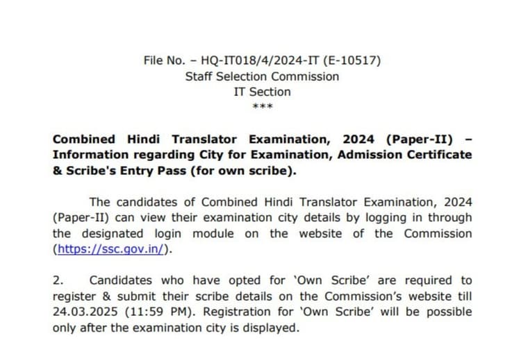 जिन उम्मीदवारों ने ‘स्वयं स्क्राइब’ (Own Scribe) का उपयोग करने का विकल्प चुना है तो उन्हें 24 मार्च 2025 (रात 11:59 बजे) तक आयोग की वेबसाइट पर पंजीकरण करना होगा और अपने स्क्राइब की डिटेल सबमिट करनी होगी. SSC JHT 2024 पेपर 2 परीक्षा सूचना सिटी दिखने के बाद ही रजिस्ट्रेशन कर पाएंगे. घोषित तिथि के अनुसार SSC JHT पेपर 2 परीक्षा 29 मार्च 2025 को आयोजित की जाएगी.
