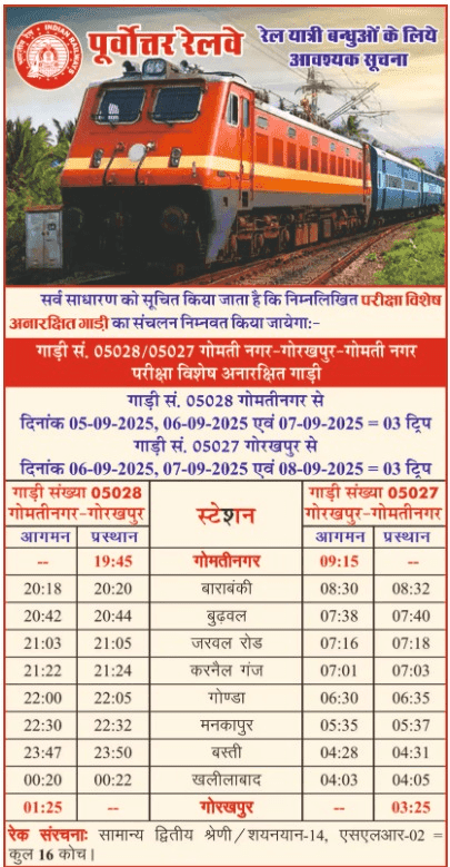 नॉर्दर्न रेलवे और नॉर्थ ईस्टर्न रेलवे ने परीक्षा में शामिल होने वाले अभ्यर्थियों के लिए कई स्पेशल ट्रेनों का ऐलान किया है. इन ट्रेनों की लिस्ट जारी कर दी गई है, जिससे लाखों परीक्षार्थियों को समय पर परीक्षा केंद्र तक पहुंचने में सहूलियत होगी.