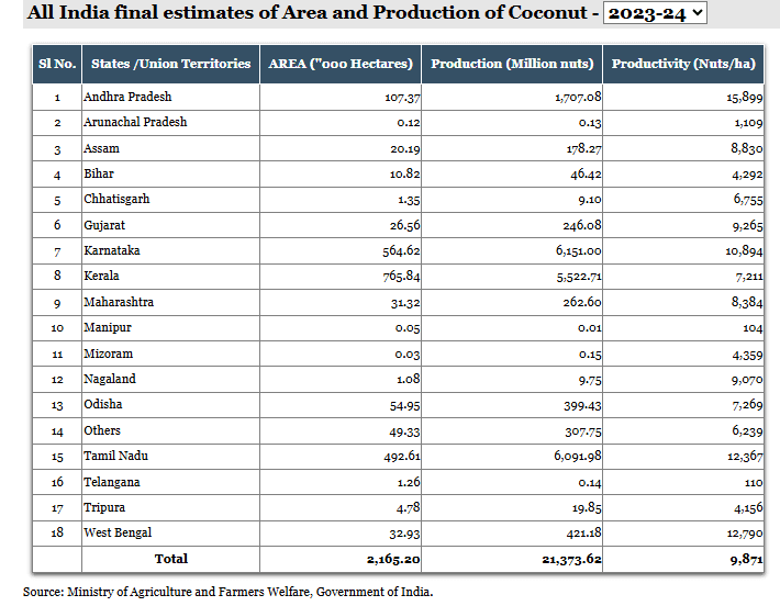 - आंध्र प्रदेश (1,707.08 मिलियन नारियल)
