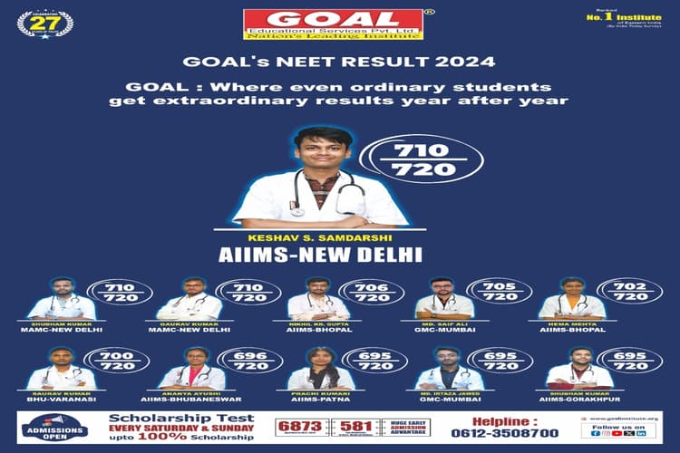 Goal Institute: NEET और JEE जैसी प्रतियोगी परीक्षाओं में हर साल लाखों स्टूडेंट बैठते हैं. इनमें कई लोग सफल होते हैं और कई छात्रों के हिस्से नाकामयाबी आती है. NEET और JEE जैसी परीक्षाओं को लेकर गोल इंस्टीट्यूट का कहना है कि सफलता पाने के लिए सही मार्गदर्शन बेहद जरूरी है. गोल इंस्टीट्यूट इस दिशा में बीते 27 सालों से काम कर रहा है. संस्थान का कहना है कि हजारों छात्रों के सपने साकार हो चुके हैं. नीट 2024 में गोल इंस्टीट्यूट में पढ़ने वाले कुल 6873 छात्र सफल हुए हैं. 581 छात्र सरकारी मेडिकल कॉलेज में भी चयनित हुए है. इस बार सात छात्रों का स्कोर 700 से अधिक था. गोल इंस्टीट्यूट ने यह भी कहा कि अभी तक संस्थान से 17,000 से अधिक डॉक्टर और इंजीनियर बन चुके हैं, जो देश-विदेश में अपनी सेवाएं दे रहे हैं. इसके अलावा, 2.5 लाख से अधिक संतुष्ट अभिभावकों का विश्वास है, जो हमारी गुणवत्तापूर्ण शिक्षा और समर्पण का प्रमाण है.