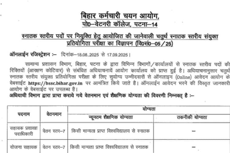 Bihar Sarkari Naukri BSSC CGL 2025: अगर आप ग्रेजुएट हैं और बिहार में सरकारी नौकरी की तलाश कर रहे हैं तो यह मौका आपके लिए सुनहरा हो सकता है. बिहार कर्मचारी चयन आयोग (BSSC) ने CGL 2025 भर्ती परीक्षा का नोटिफिकेशन जारी कर दिया है. इस परीक्षा के माध्यम से राज्य के विभिन्न विभागों में कुल 1,481 पदों पर भर्ती की जाएगी. BSSC CGL न केवल युवाओं को सरकारी सेवा का मौका देता है, बल्कि यह एक प्रतिष्ठित करियर की शुरुआत भी है. इस आर्टिकल में जानिए BSSC CGL 2025 से जुड़ी जरूरी जानकारी – आवेदन की तारीख से लेकर परीक्षा पैटर्न तक.