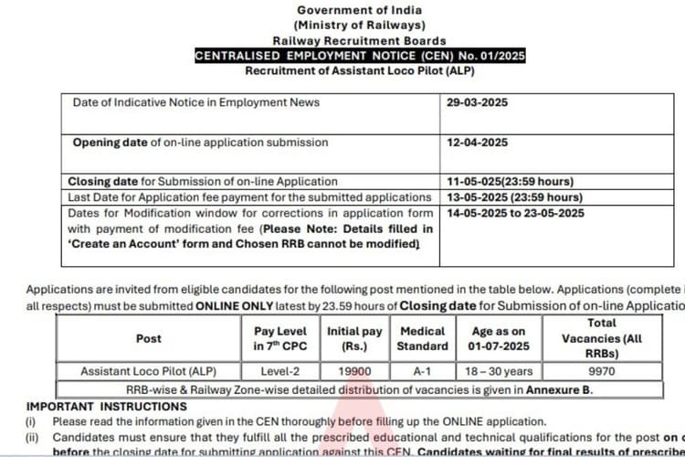 | आरआरबी एएलपी अधिसूचना जारी | 11 अप्रैल 2025 |