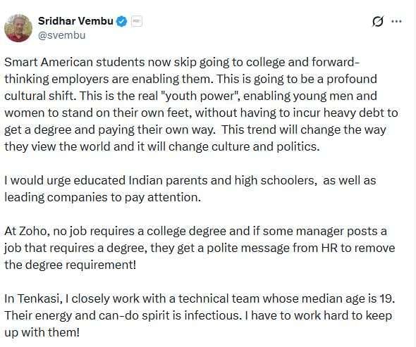 Zoho Hires without a Degree: मां-बाप को लगता है कि अगर बच्चा कॉलेज की डिग्री नहीं लेगा, तो उसे अच्छी नौकरी नहीं मिलेगी. लेकिन इसी सोच को तोड़ते हुए Zoho के फाउंडर श्रीधर वेम्बू ने एक बड़ा बयान दिया है. उन्होंने साफ कहा है कि उनकी कंपनी Zoho बिना डिग्री वाले लोगों को भी नौकरी देती है.
