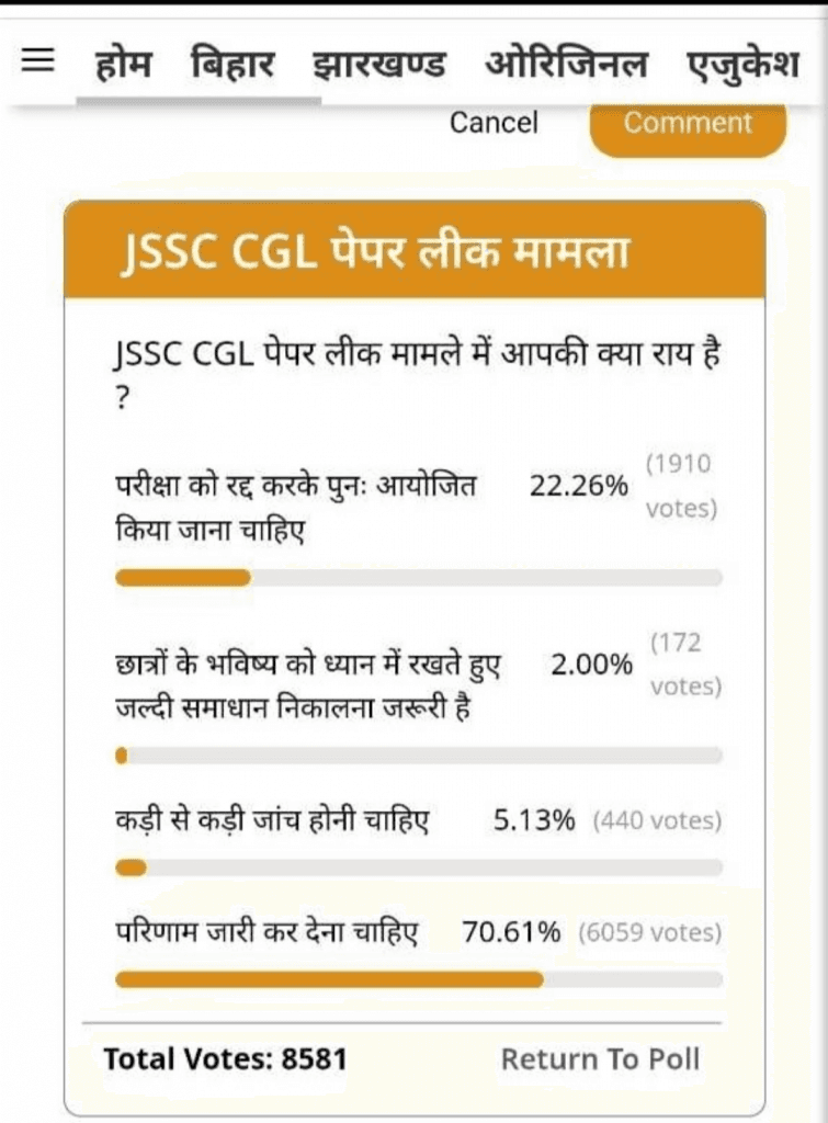 JSSC CGL Result: जेएसएससी सीजीएल पेपर लीक के मुद्दे को लेकर प्रभात खबर ने एक खास पोल किया था जिसमें 8 हजार से ज्यादा लोगों ने अपनी प्रतिक्रिया बताई है कि रिजल्ट जारी होना चाहिए या नहीं. यहां देखें इस पोल के नतीजे.
