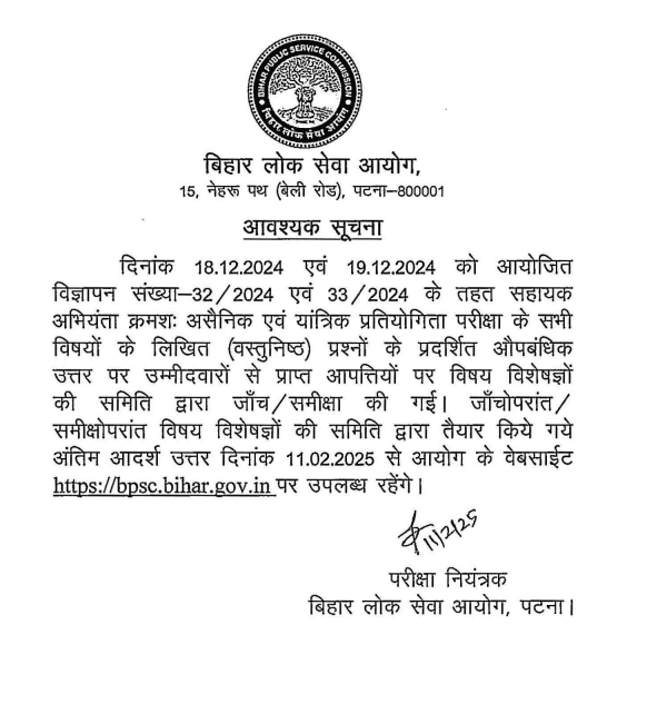 बीपीएससी सहायक अभियंता भर्ती परीक्षा का आयोजन 18 और 19 दिसंबर, 2024 को किया गया था. यह परीक्षा विभिन्न तकनीकी विषयों के अंतर्गत आयोजित की गई थी, जिसमें उम्मीदवारों से उनके ज्ञान और कौशल का मूल्यांकन किया गया. परीक्षा के बाद, बिहार लोक सेवा आयोग ने 21 जनवरी, 2025 को अनंतिम उत्तर कुंजी जारी की थी, ताकि उम्मीदवार अपनी उत्तरों का मिलान कर सकें और यदि कोई त्रुटि हो तो उसे आयोग के सामने प्रस्तुत कर सकें. आयोग ने इस अनंतिम उत्तर कुंजी पर उम्मीदवारों से आपत्तियां भी आमंत्रित की थीं, ताकि यदि किसी प्रश्न में कोई गलती हो या उत्तर सही न हो, तो उसे सही किया जा सके. इन आपत्तियों की समीक्षा करने के बाद, आयोग ने अब 11 फरवरी, 2025 को परीक्षा की अंतिम उत्तर कुंजी प्रकाशित कर दी है. यह अंतिम उत्तर कुंजी उम्मीदवारों के लिए एक महत्वपूर्ण दस्तावेज है, क्योंकि इसके आधार पर परीक्षा परिणाम तैयार किया जाएगा.