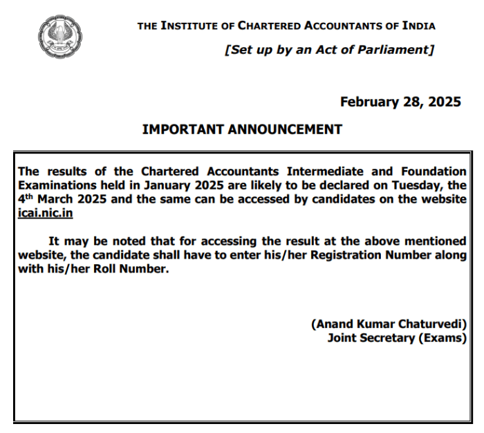 ICAI CA January Result: इंस्टीट्यूट ऑफ चार्टर्ड अकाउंटेंट्स ऑफ इंडिया (ICAI) ने जनवरी 2025 के सीए इंटर और फाउंडेशन परीक्षा परिणाम की घोषणा की तिथि का ऐलान कर दिया है. संस्थान 4 मार्च 2025 को इन परीक्षाओं के परिणाम जारी कर सकता है. इसके बाद, उम्मीदवार अपने परिणाम को आधिकारिक वेबसाइट icai.nic.in पर जाकर देख सकते हैं. आईसीएआई ने एक आधिकारिक नोटिस में बताया, “जनवरी 2025 में आयोजित चार्टर्ड अकाउंटेंट्स इंटरमीडिएट और फाउंडेशन परीक्षाओं के परिणाम 4 मार्च 2025, मंगलवार को घोषित होने की संभावना है. उम्मीदवार इसे वेबसाइट icai.nic.in पर देख सकते हैं.”