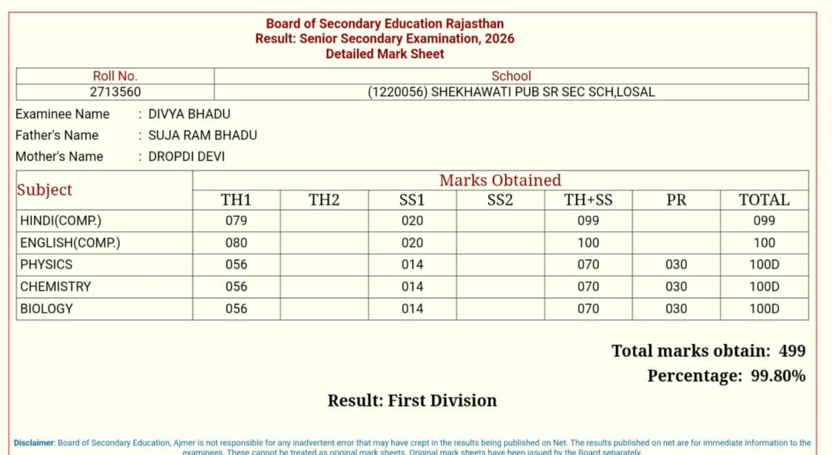 मार्कशीट के अनुसार दिव्या भादू का रोल नंबर 2713560 है और उन्होंने शेखावाटी पब्लिक सीनियर सेकेंडरी स्कूल, लोसल से परीक्षा दी थी. कुल मिलाकर उन्हें 500 में से 499 अंक मिले हैं. इसके साथ ही उनका प्रतिशत 99.80% दर्ज किया गया है. रिजल्ट में उनका डिवीजन फर्स्ट डिवीजन बताया गया है. इतनी शानदार उपलब्धि के बाद दिव्या का नाम पूरे राज्य में चर्चा का विषय बन गया है.